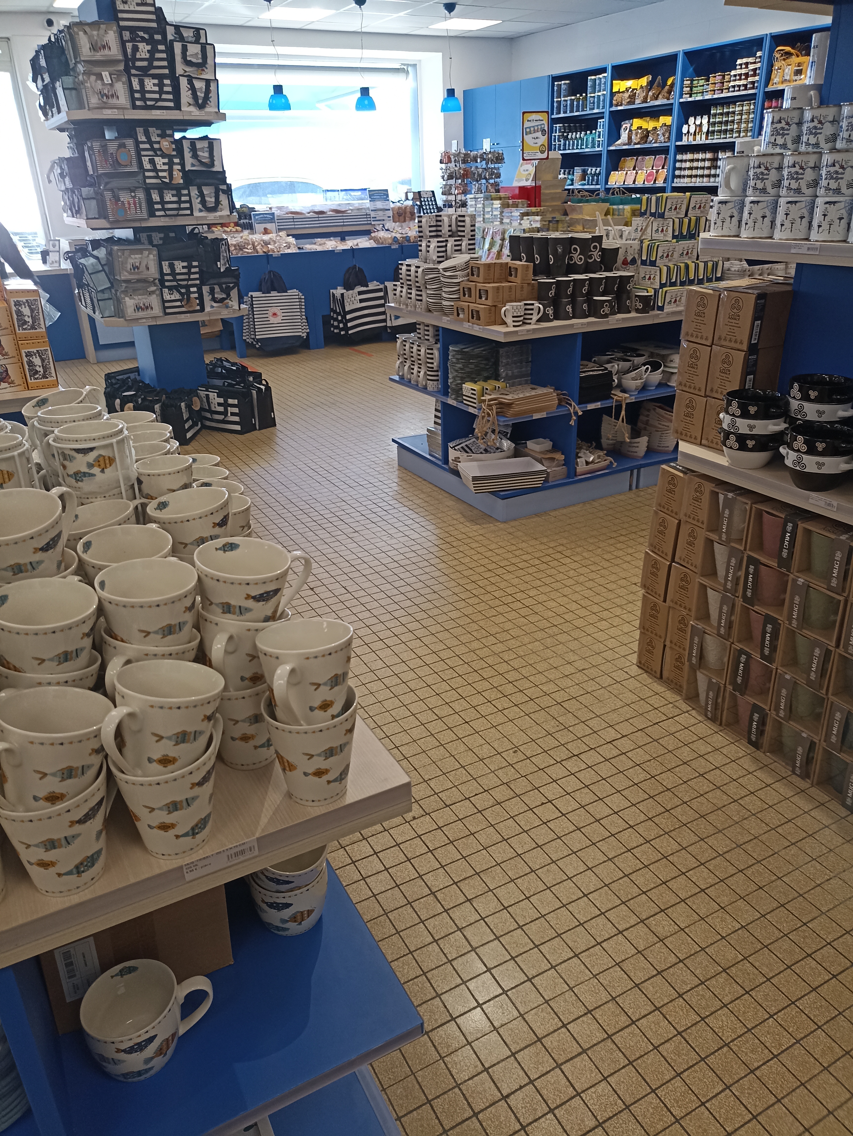 Beau magasin situé à Camaret sur Mer, après le premier commerce de souvenirs, propre, clair, net, bien rangé et achalandé, personnel agréable, sérieux, toutes sortes de produits régionaux, bouteilles, poteries, décorations, accessoires, gadgets, ustensiles, serviettes, torchons, cartes, jeux, sardines, chocolats, sucettes, portes clés, stylos, bolets, tasses, assiettes, verres, tabliers, serviettes, plateaux, ne pas hésiter à y aller selon les besoins, les heures, les jours, les saisons, gâteaux bretons, kouign hammam, madeleines, crêpes, difficile de ressortir sans rien du tout.